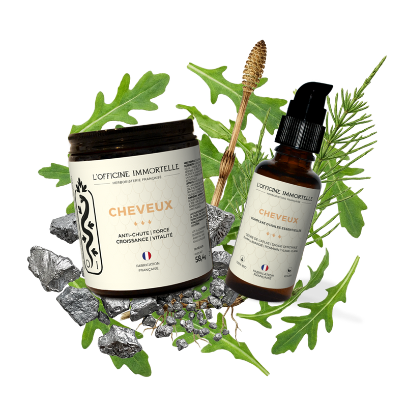 Huile de soin Cheveux : Huiles essentielles : Cananga odorata (Ylang-Ylang), Cedrus atlantica (CĂšdre de lâAtlas), Rosmarinus officinalis Ă cinĂ©ole (Romarin), Thymus vulgaris Ă thymol (Thym), Salvia officinalis (Sauge), Lavandula angustifolia (Lavande). Huiles vĂ©gĂ©tales : de premiĂšre pression Ă froid de Simmondsia chinensis (Jojoba), Corylus avellana (Noisette), de Sesamum indicum (SĂ©same), Carthamus tinctorius (Carthame), d'Helianthus annuus (Tournesol). Teneur totale en HE : 25 ml/L.